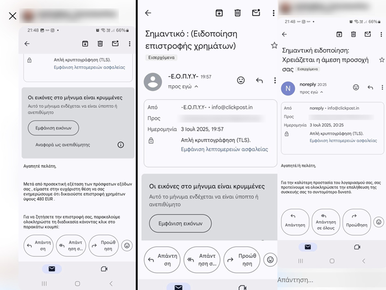 Η δράση των αετονύχηδων απατεώνων του διαδικτύου συνεχίζεται, με νέα κόλπα με τα οποία προσπαθούν να παγιδέψουν ανυποψίαστους πολίτες, μέσω του κόλπου της… επιστροφής φόρου, ώστε να τους κάνουν να αποκαλύψουν τα στοιχεία των προσωπικών τους λογαριασμών, προκειμένου να λάβουν το υποτιθέμενο πόσο που τους… επιστρέφεται. Όσοι βέβαια είναι αφελείς και την… πατήσουν, θα δουν να… αδειάζουν οι λογαριασμοί τους, από όσα χρήματα προλάβουν να τραβήξουν οι απατεώνες, πριν ειδοποιήσουν οι τράπεζες τους παθόντες.