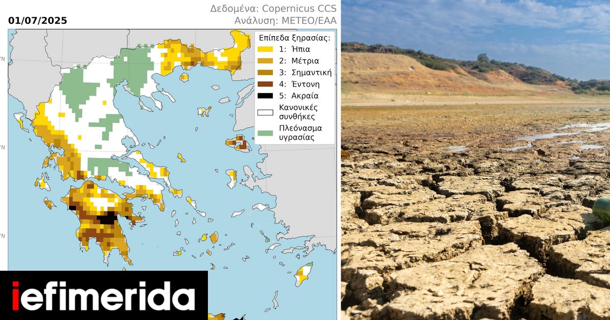 Στον παρακάτω χάρτη απεικονίζεται ο δείκτης ξηρασίας στην Ελλάδα την 1η Ιουλίου 2025,… Πηγή