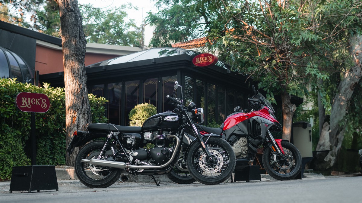 Με το τεχνολογικά προηγμένο Ducati Multistrrada V4 S και το premium κλασικό Triumph Bonneville T100 επισκεφτήκαμε το εστιατόριο Rick’s στην Κηφισιά για ένα αξέχαστο δείπνο.