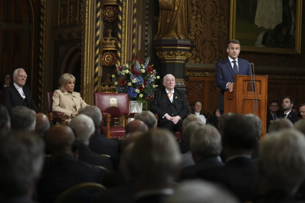 French President Emmanuel Macron addresses parliament in the Palace of Westminster, London, Tuesday, July 8, 2025.(AP Photo/Alastair Grant, Pool)