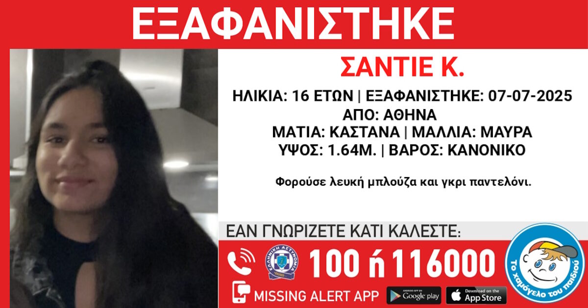 Συναγερμός σήμανε για την εξαφάνιση της 16χρονης Σαντιέ Κ. από χώρο φιλοξενίας στην Αθήνα, όπως ανακοίνωσε το «Χαμόγελο του Παιδιού».
