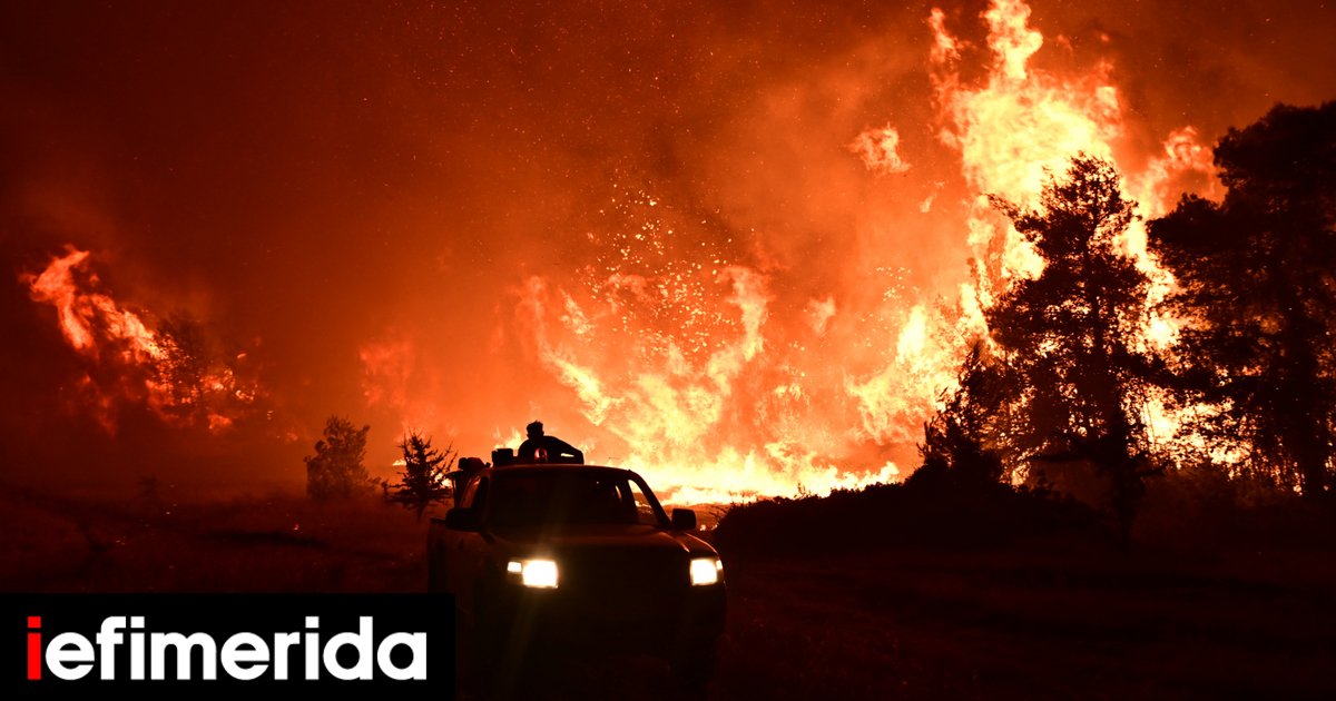 Μέσα σε μισή ώρα, από τις 21:00 που σταμάτησαν οι πτήσεις των εναέριων μέσων, αλλά και βοηθούντος του δυνατού ανέμου που πνέει, οι πύρινες γλώσσες φούντωσαν σε ύψος έως και 30 μέτρα (!) και δημιουργούνται διαρκώς κηλιδώσεις, ανοίγοντας το μέτωπο της πυρκαγιάς.