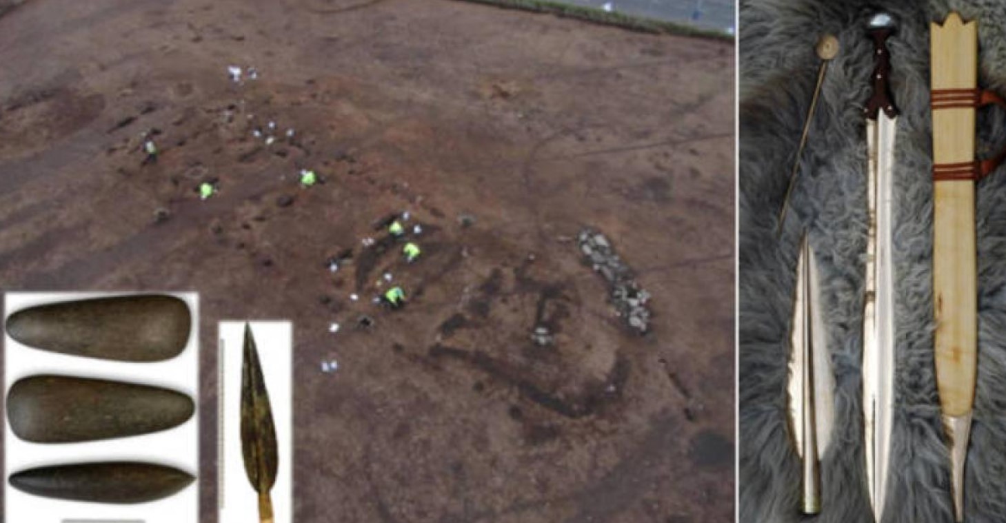 Στην ίδια τοποθεσία βρέθηκε ένα μεγάλο οπλοστάσιο από την Εποχή του Χαλκού, που περιλαμβάνει μεταξύ άλλων ένα σπαθί και μια αιχμή δόρατος διακοσμημένη με χρυσό. Πηγή: GUARD Archaeology