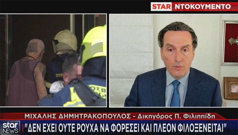 «Κάηκαν τα πάντα στη ζωή του μέχρι και τα ρούχα του» λέει ο Μιχάλης Δημητρακόπουλος δικηγόρος του Πέτρου Φιλιππίδη για τη φωτιά στο σπίτι του ηθοποιού και προσθέτει, «Είναι ένας άνθρωπος που δεν έχει πού να κοιμηθεί και φιλοξενείται αυτή τη στιγμή από συγγενικό του πρόσωπο. Βρίσκεται σε απόγνωση».