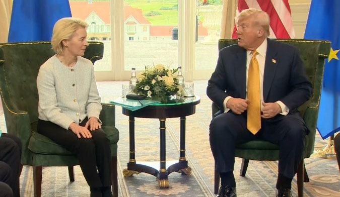 Ο πρόεδρος των ΗΠΑ Ντόναλντ Τραμπ και η πρόεδρος της Ευρωπαϊκής Επιτροπής Ούρσουλα φον ντερ Λάιεν κατέληξαν σήμερα σε μια δασμολογική συμφωνία, στη συνάντηση-εξπρές που είχαν στο Τέρνμπερι της Σκωτίας.
