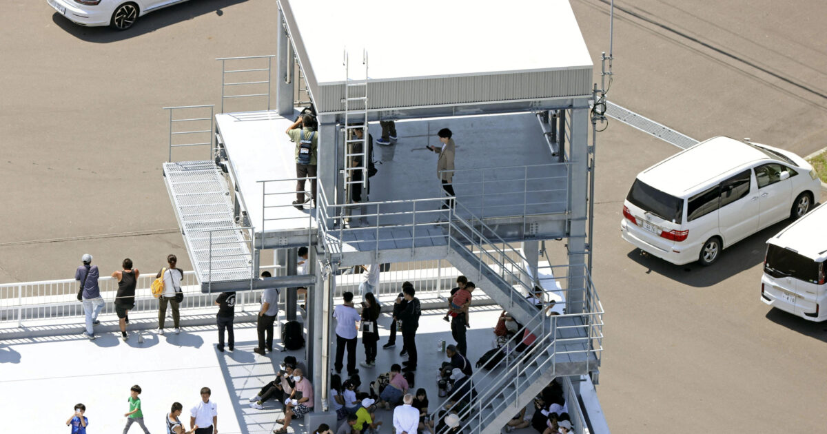 Άνθρωποι φαίνονται στην οροφή κτιρίου πυροσβεστικού σταθμού αφού η Ιαπωνία εξέδωσε συναγερμό εκκένωσης μετά τον μεγάλο σεισμό στη χερσόνησο Καμτσάτκα στην πόλη Mukawa, στο Χοκάιντο της Ιαπωνίας στις 30 Ιουλίου 2025 / Kyodo via Reuters