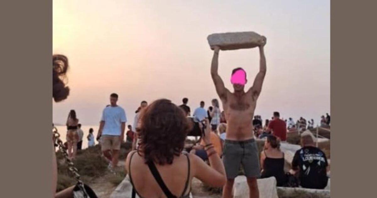 Σε ανάρτηση του επιχειρηματία Αλέξανδρου Φραντζέσκου στο Facebook, καταγράφεται η στιγμή που επισκέπτης σηκώνει και κρατά πάνω από το κεφάλι του ένα κομμάτι μαρμάρου από τον ευρύτερο αρχαιολογικό χώρο της Πορτάρας στη Νάξο, ενώ φωτογραφίζεται αμέριμνος, μέσα σε πλήθος κόσμου.
