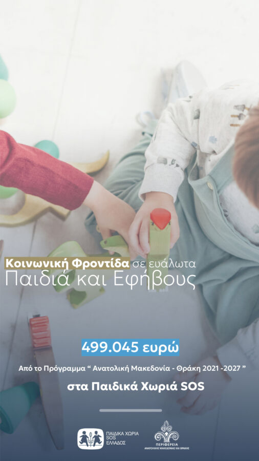 Η Περιφέρεια Ανατολικής Μακεδονίας και Θράκης ενέταξε στο Πρόγραμμα «Ανατολική Μακεδονία, Θράκη 2021-2027» χρηματοδότηση 499.045 ευρώ για την υλοποίηση πιλοτικών δράσεων κοινωνικής φροντίδας σε ευάλωτα παιδιά και εφήβους. Οι δράσεις θα πραγματοποιηθούν σε συνεργασία με τα Παιδικά Χωριά SOS Ελλάδος.