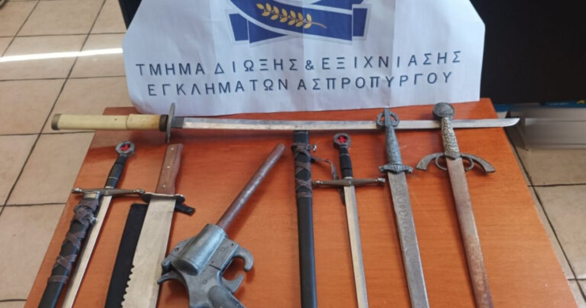 Πιστόλι, κατάνα και ξίφη εντόπισε η αστυνομία στο σπίτι μίας 25χρονης γυναίκας στον Ασπρόπυργο.