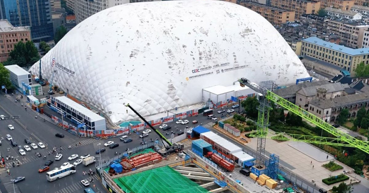 Αν βρεθεί κανείς στους δρόμους της Jinan, στην Κίνα, δεν αποκλείεται να νομίσει ότι βλέπει μια τεράστια φούσκα να αιωρείται πάνω από τον ορίζοντα. Στην πραγματικότητα, πρόκειται για την πιο εντυπωσιακή καινοτομία στον χώρο των κατασκευών των τελευταίων ετών: ένα φουσκωτό κάλυμμα επιφάνειας 20.000 τετραγωνικών μέτρων και ύψους 50 μέτρων, το οποίο αγκαλιάζει ολόκληρο το έργο Honglou 1905. Το δημιούργημα της China Energy Construction Group και της Licheng Urban Development Group έχει ήδη χαρακτηριστεί ως η μεγαλύτερη φουσκωτή κατασκευαστική «φούσκα» στον κόσμο.