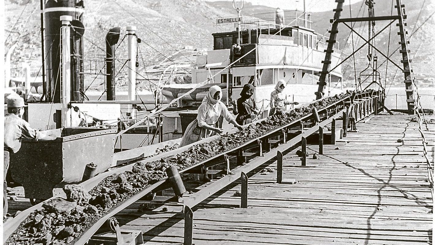 Εργάτριες στον ιμάντα χειροδιαλογής μεταλλευμάτων στη σκάλα φόρτωσης του Κουταλά το 1961 (Α.Ζ. Φραγκίσκος. Ψηφιακό Αρχείο Εργαστηρίου Αστικού Περιβάλλοντος ΕΜΠ)