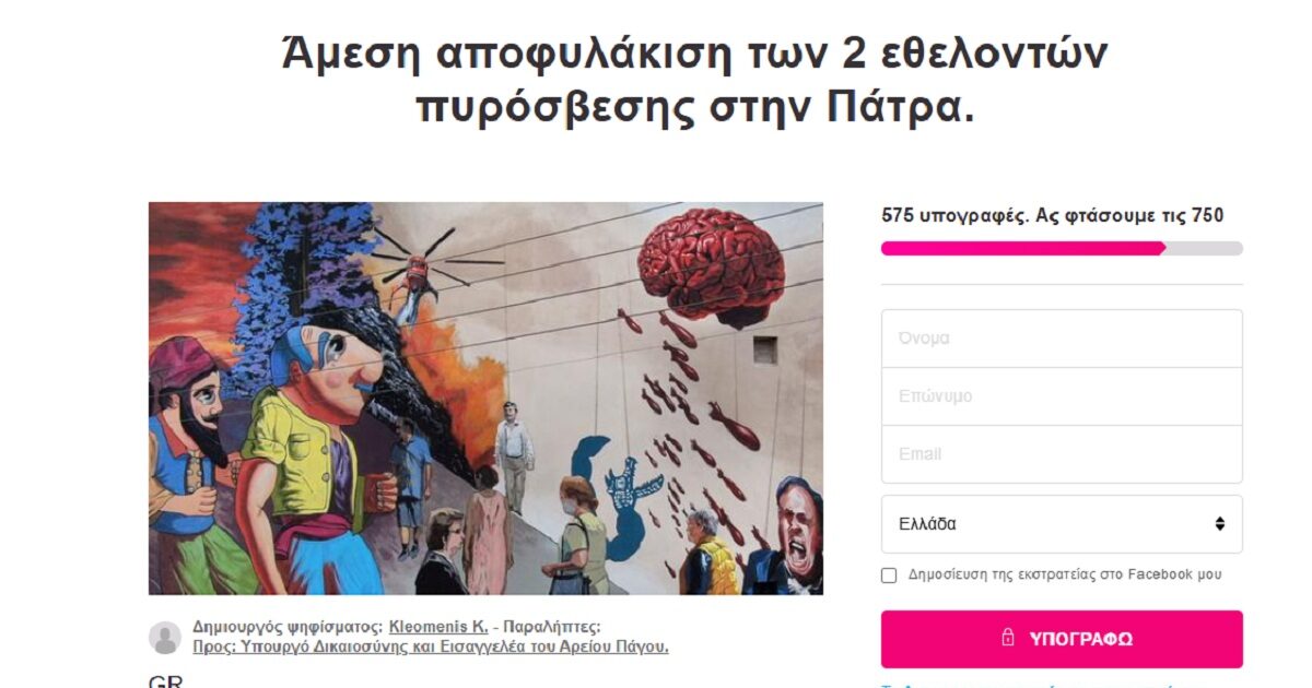 Υπογραφές με σκοπό την άμεση αποφυλάκιση του 25χρονου και του 21χρονου, που κατηγορούνται για εμπρησμό στην περιοχή του Γηροκομείου, στην Πάτρα, την Τετάρτη 13 Αυγούστου, συγκεντρώνονται μέσω διαδικτυακής πλατφόρμας.