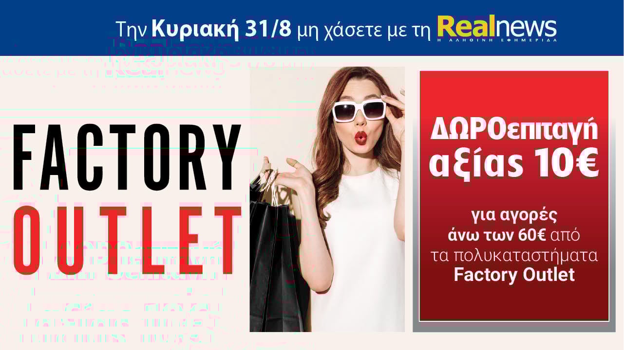 Την Κυριακή με τη Realnews: Δωροεπιταγή 10€ Enikos Newsroom 08:00, Τετάρτη 27 Αυγούστου 2025 Media Δωροεπιταγή αξίας 10€ για αγορές άνω των 60€ από τα πολυκαταστήματα Factory Outlet.