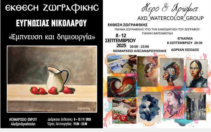 Η Ένωση Πολιτιστικών Φορέων Έβρου (ΕΠΟΦΕ) διοργανώνει Έκθεση Ζωγραφικής των καλλιτεχνών Ευγνωσίας Νικολάρου και της ομάδας axd_watercolor_group με θεματογραφία «Έμπνευση & Δημιουργία» – «Νερό & Χρώμα» στο Εκθεσιακό Κέντρο του Νομαρχείου στην Αλεξανδρούπολη.