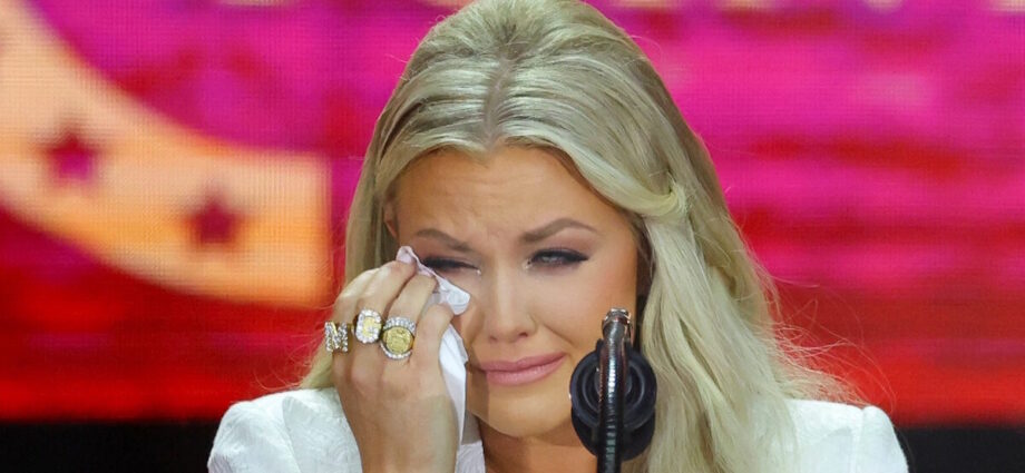 Η Έρικα Κερκ, η χήρα του Τσάρλι Κερκ δεν μπορεί να συγκρατήσει τα δάκρυά της στην νεκρώσιμη τελετή του ανθρώπου της / Reuters / Carlos Barria