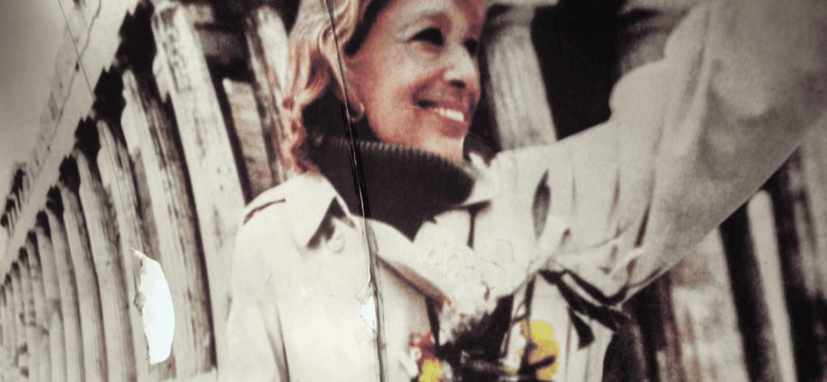 Η φωτογραφία απεικονίζει την υπουργό Πολιτισμού επί κυβερνήσεων Ανδρέα Παπανδρέου να χαιρετά χαμογελαστή πάνω στον Ιερό Βράχο της Ακρόπολης, κρατώντας ένα μπουκέτο λουλούδια.