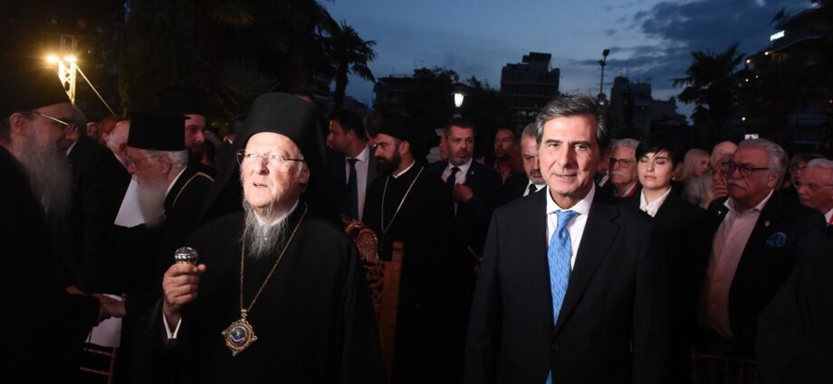 Στην κατάμεστη από εκατοντάδες κόσμου αυλή του υπουργείου Μακεδονίας-Θράκης, ο Οικουμενικός Πατριάρχης, κ. Βαρθολομαίος τέλεσε απόψε το βράδυ τα εγκαίνια της έκθεσης φωτογραφίας του Γιάννη Γιαννάτου «Άγιον Ορος – Πέρα από το ορατό» και περιέγραψε το διαχρονικό μήνυμα του Αγίου Όρους με δύο λέξεις «σιωπή και προσευχή». Στις πάνω από 23.00 φωτογραφίες ο καλλιτέχνης αποτυπώνει τη μοναστική ζωή στο Περιβόλι της Παναγίας, σε μια δουλειά μέρος της οποίας κυκλοφορεί σε λεύκωμα από την Ιερά Μεγίστη Μονή Βατοπεδίου, με κείμενα της αδελφότητας του μοναστηριού.