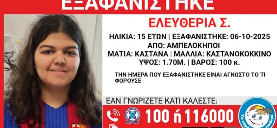 Συναγερμός σήμανε στην αστυνομία μετά την εξαφάνιση της Ελευθερίας Σ., 15 ετών. Όπως ανακοίνωσε το «Χαμόγελο του Παιδιού» την Τετάρτη (08.10.2025), τα ίχνη της ανήλικης χάθηκαν μέσα από νοσοκομείο στην περιοχή των Αμπελοκήπων.
