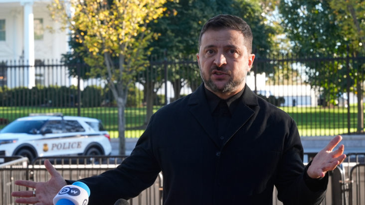 Ukraine’s President Volodymyr Zelenskyy speaks to reporters in Lafayette Park across the street from the White House, following a meeting with President Donald Trump, Friday, Oct. 17, 2025, in Washington. (AP Photo/Manuel Balce Ceneta)