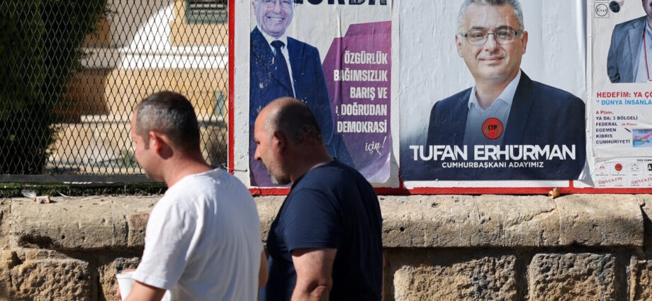 Τουρκοκύπριοι περνούν μπροστά από προεκλογική αφίσα του Tufan Erhurman / REUTERS / Φωτογραφία Yiannis Kourtoglou
