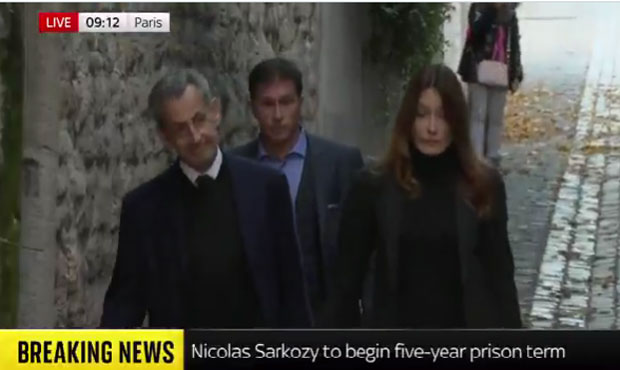 Ο πρώην Πρόεδρος της Γαλλίας Νικολά Σαρκοζί αναχώρησε σήμερα το πρωί από την κατοικία του στο Παρίσι, χέρι-χέρι με τη σύζυγό του Κάρλα Μπρούνι και υπό τις επευφημίες υποστηρικτών του που είχαν συγκεντρωθεί φωνάζοντας «Νικολά, Νικολά», για να πάει στη φυλακή Λα Σαντέ της πρωτεύουσας όπου θα αρχίσει την έκτιση της ποινής πενταετούς φυλάκισης που του έχει επιβληθεί.