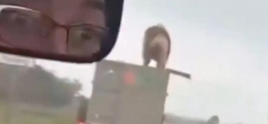Βίντεο που κυκλοφόρησε στα social media δείχνει το λιοντάρι να στέκεται στην οροφή του τρέιλερ αφού κατάφερε να δραπετεύσει από την καταπακτή, κοντά στην περιοχή του Bakerville.