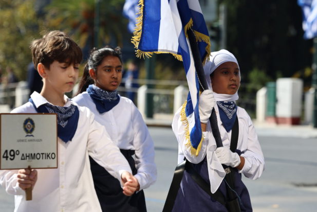 Αντιπροσωπευτικά τμήματα μαθητών και μαθητριών από όλα τα σχολεία του δήμου Αθηναίων παρήλασαν στο κέντρο της πόλης, περνώντας μπροστά από το μνημείο του Άγνωστου Στρατιώτη και το ελληνικό Κοινοβούλιο, συνοδεία της φιλαρμονικής ορχήστρας του δήμου Αθηναίων.
