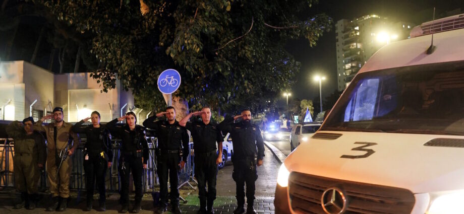 Ισραηλινοί αστυνομικοί και στρατιώτες χαιρετούν, καθώς περνά από μπροστά τους κονβόι που μεταφέρει τα πτώματα των δύο ομήρων / REUTERS / Φωτογραφία Itay Cohen