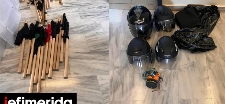Σφυριά, πυροσβεστήρες, κράνη, αντιασφυξιογόνες μάσκες, καδρόνια, ακόμα και ασυρμάτους.