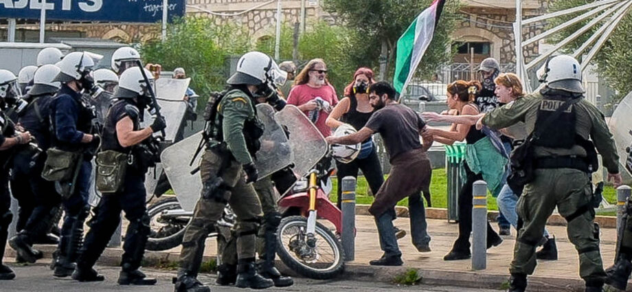 Διαδηλωτές πέταξαν μπογιές στα λεωφορεία, φωνάζοντας συνθήματα, ενώ η αστυνομία προχώρησε σε ρίψη κρότου – λάμψης, σύμφωνα με το kriti360.gr.