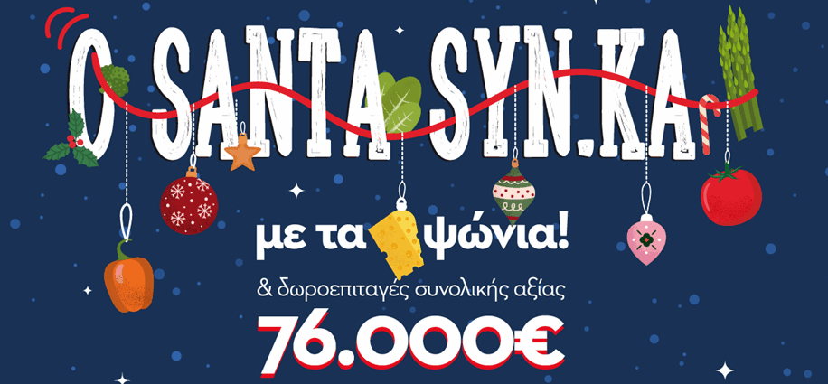 Η ελληνική αλυσίδα σούπερ μάρκετ SYN.KA υποδέχεται τη φετινή εορταστική περίοδο με έναν μεγάλο χριστουγεννιάτικο διαγωνισμό και… με τον SANTA SYN.KA να χτυπάει και τη δική σου πόρτα! Γιατί φέτος, αντί για δώρα κάτω από το δέντρο, ο SANTA φέρνει δωροεπιταγές για τα ψώνια σου!