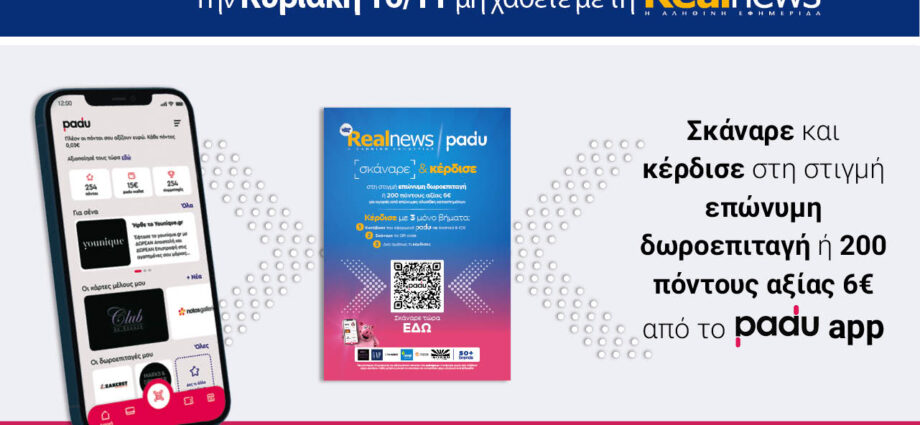 Αυτή την Κυριακή με τη Realnews: Σκάναρε & κέρδισε με το padu app Enikos Newsroom 08:00, Τετάρτη 12 Νοεμβρίου 2025 Media Σκάναρε και κέρδισε στη στιγμή επώνυμη δωροεπιταγή ή 200 πόντους αξίας 6€ για αγορές από επώνυμες αλυσίδες καταστημάτων με το padu app.