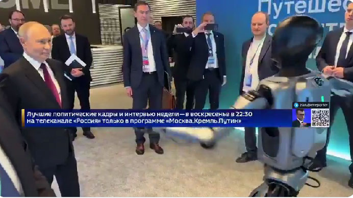 Κατά τη διάρκεια της επίδειξης, την οποία πρόβαλε η κρατική τηλεόραση, ο Βλαντίμιρ Πούτιν εμφανίζεται να στέκεται απέναντι από το ανθρωποειδές ρομπότ, το οποίο λέει στον Ρώσο πρόεδρο, προτού αρχίσει να χορεύει, ότι είναι το αγαπημένο του τραγούδι.