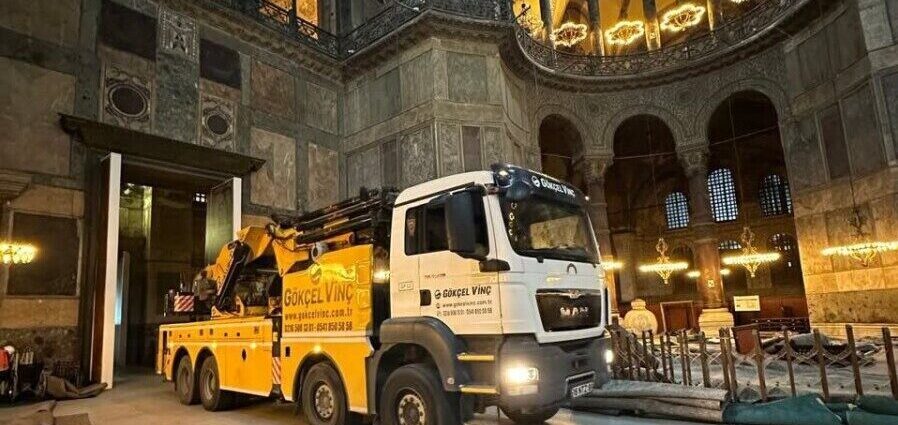 Η παρουσία ενός βαρέος φορτηγού – γερανού στον εσωτερικό χώρο της Αγίας Σοφίας έχει προκαλέσει έντονες ανησυχίες σχετικά με τον τρόπο διεξαγωγής των εργασιών αποκατάστασης που βρίσκονται σε εξέλιξη. Ads Φωτογραφίες που κυκλοφόρησαν στα μέσα κοινωνικής δικτύωσης δείχνουν το όχημα να οδηγείται πάνω στο ιστορικό δάπεδο και να σταθμεύει πάνω σε προσωρινά προστατευτικά πάνελ, εγείροντας ερωτήματα για το αν το εύθραυστο έδαφος προστατεύεται επαρκώς.
