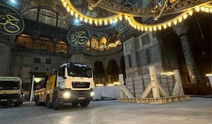 Ανησυχία έχει επικρατήσει τις τελευταίες ημέρες στην Κωνσταντινούπολη καθώς η παρουσία ενός βαρέος φορτηγού – γερανού στον εσωτερικό χώρο του μνημείου της Αγίας Σοφίας έχει προκαλέσει έντονες αμφιβολίες σχετικά με τον τρόπο διεξαγωγής των  εργασιών αποκατάστασης που βρίσκονται σε εξέλιξη.