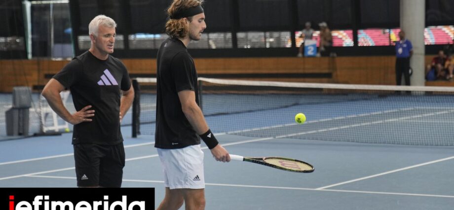 Ο Στέφανος Τσιτσιπάς προπονείται μαζί με τον πατέρα του, Απόστολο / Φωτογραφία αρχείου: AP Photo/Dita Alangkara