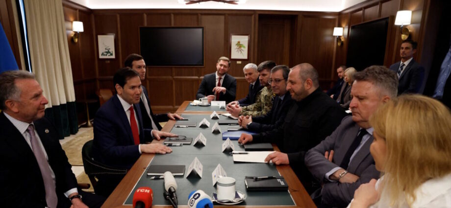 Ο υπουργός Εξωτερικών των ΗΠΑ Μάρκο Ρούμπιο στα αριστερά) συνομιλεί με τον Ρουστέμ Ουμέροφ, γραμματέα του Συμβουλίου Ασφάλειας της Ουκρανίας (στα δεξιά) / REUTERS / Eva Marie Uzcategui