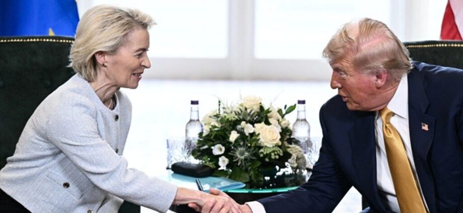 ΗΠΑ και Ευρωπαϊκή Ένωση κατέληξαν σε μια εμπορική συμφωνία – πλαίσιο χθες, Κυριακή, τερματίζοντας μήνες αβεβαιότητας για επιχειρηματίες και καταναλωτές και στις δύο πλευρές του Ατλαντικού, λίγες μέρες πριν από την εκπνοή του αμερικανικού τελεσιγράφου για επιβολή υψηλών δασμών από 1ης Αυγούστου. Ντόναλντ Τραμπ και Ούρσουλα φον ντερ Λάιεν έδωσαν τα χέρια και συμφώνησαν στη δέσμη μέτρων που είχαν μελετήσει νωρ΄θιτερα οι τεχνικές ομάδες των δύο πλευρών.