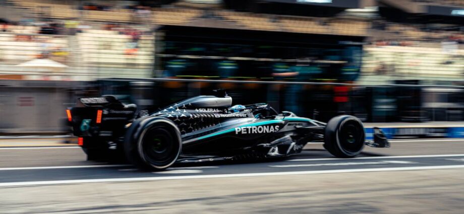 Ο Τζορτζ Ράσελ σημείωσε τον πρώτο χρόνο στην τελευταία περίοδο ελεύθερων δοκιμών του 2025. Νόρις και Φερστάπεν πίσω του, στον τοίχο ο Χάμιλτον.