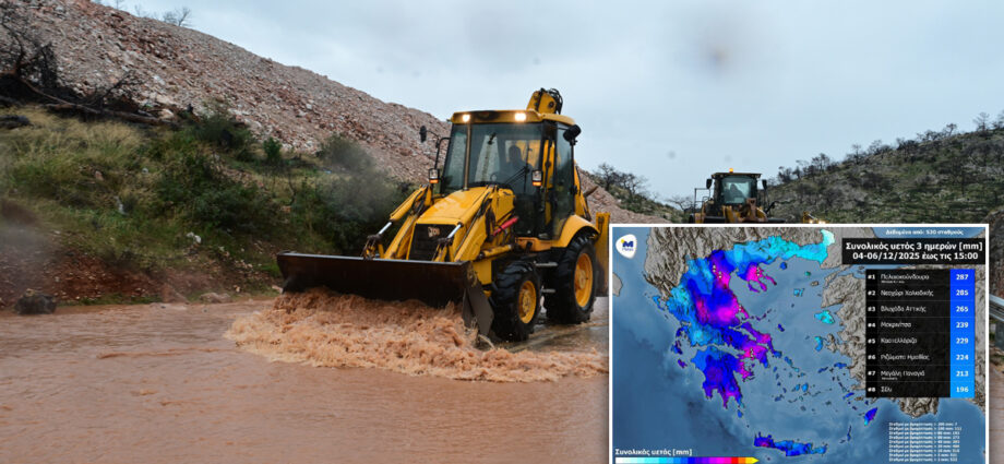 Στην Παλαιοκούνδουρα, στη Μάνδρα Αττικής, καταγράφηκε το μεγαλύτερο ύψος βροχής του τριημέρου (4/12 με 6/12) με 287 χιλιοστά βροχής, σύμφωνα με το δίκτυο σταθμών του meteo.gr / Εθνικού Αστεροσκοπείου Αθηνών.