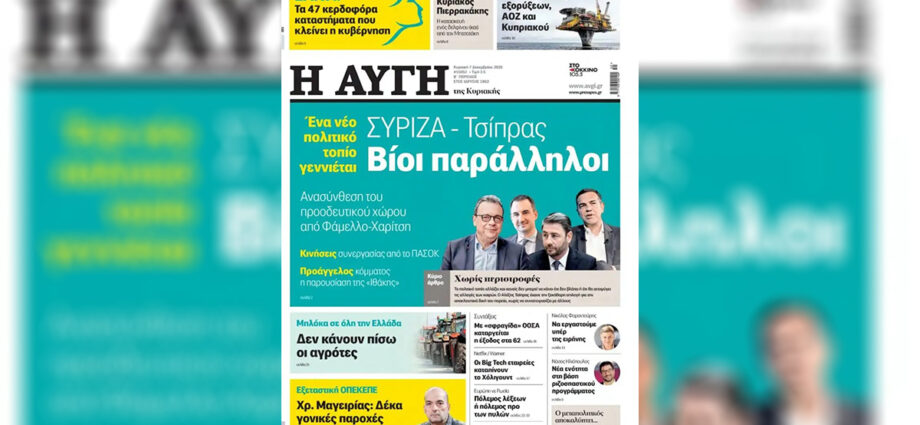 Tο πρωτοσέλιδο έχει τίτλο «ΣΥΡΙΖΑ-Τσίπρας: Βίοι παράλληλοι» και σημειώνει πως ένα νέο πολιτικό τοπίο γεννιέται. Αναφέρεται, δε, σε ανασύνθεση του «προοδευτικού χώρου από Φάμελλο-Χαρίτση», καθώς και σε «κινήσεις συνεργασίας από το ΠΑΣΟΚ». Το δημοσίευμα σημειώνει επίσης ότι «η… Πηγή