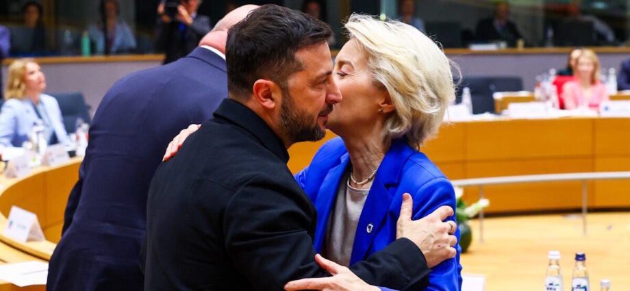 Η πρόεδρος της Κομισιόν, Ursula von der Leyen με τον Ουκρανό Πρόεδρο, Volodymyr Zelenskyy / AP/ Φωτογραφία Yves Herman