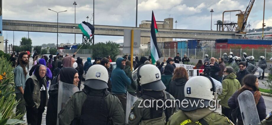 Ενόψει της άφιξης του πλοίου, συλλογικότητες και ομάδες αλληλεγγύης προς τον παλαιστινιακό λαό πραγματοποίησαν συγκέντρωση διαμαρτυρίας στο λιμάνι της Σούδας.