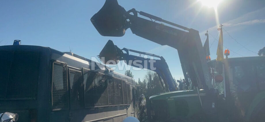 Νωρίς το μεσημέρι, οι αγρότες περίπου 100 μέτρα πριν από αεροδρόμιο Μακεδονία βρήκαν παραταγμένη μια κλούβα των ΜΑΤ και έτσι σταμάτησαν.
