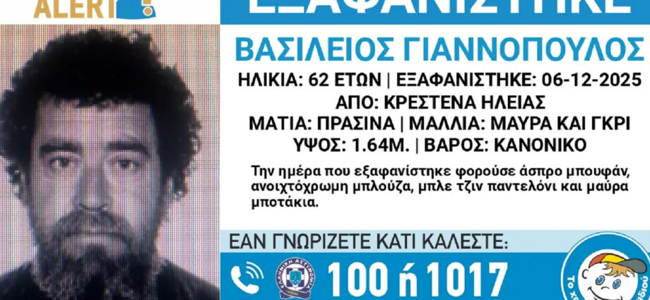 Ένας 62χρονος άνδρας αγνοείται από το Σάββατο 6 Δεκεμβρίου στα Κρέστενα Ηλείας, με το «Χαμόγελο του Παιδιού» να εκδίδει ανακοίνωση για την εξαφάνισή του. Ο οργανισμός ενημερώθηκε στις 9 Δεκεμβρίου και, ύστερα από αίτημα των συγγενών του, προχώρησε στη δημοσιοποίηση των στοιχείων του, καθώς υπάρχουν φόβοι ότι η ζωή του μπορεί να βρίσκεται σε κίνδυνο.
