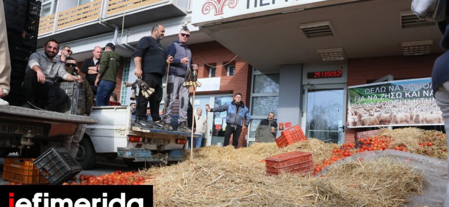 Οι αγρότες απέκλεισαν σήμερα το κτίριο και στο πλαίσιο της διαμαρτυρίας τους πέταξαν άχυρα, ντομάτες και σταφύλια μπροστά από την είσοδο των κτιρίων, αλλά και μέσα στα κτίρια, ενώ έριξαν και γάλα.