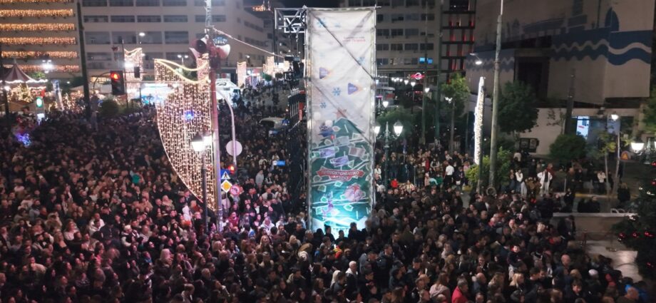 Η νύχτα έγινε μέρα στον Πειραιά, όταν τα 120.000 λαμπιόνια του επιβλητικού χριστουγεννιάτικου δέντρου άναψαν και ο ουρανός φωτίστηκε από εντυπωσιακά πυροτεχνήματα.