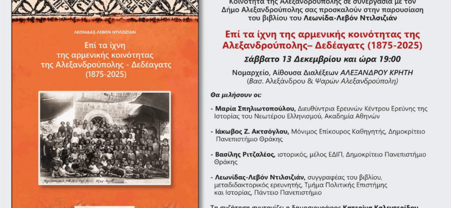 Οι Εκδόσεις του Περιοδικού «Αρμενικά» και η Αρμενική Κοινότητα της Αλεξανδρούπολης σε συνεργασία με τον Δήμο Αλεξανδρούπολης σας προσκαλούν στην παρουσίαση του βιβλίου του Λεωνίδα-Λεβόν Ντιλσιζιάν «Επί τα ίχνη της αρμενικής κοινότητας της Αλεξανδρούπολης – Δεδέαγατς (1875-2025)».