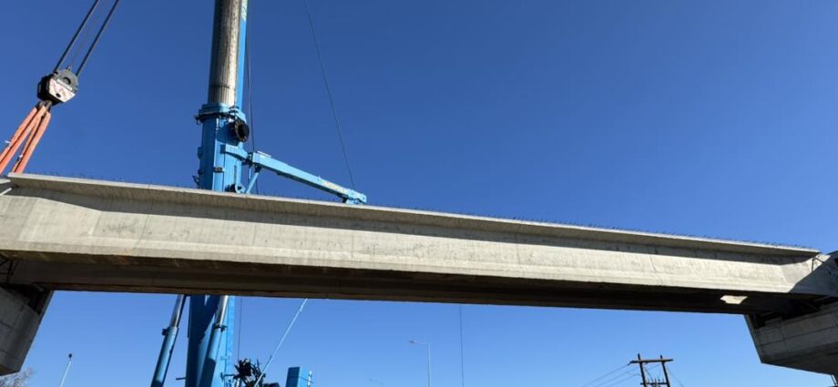 Στην υπό διαμόρφωση γέφυρα, πάνω από την εθνική οδό, τοποθετούνται οι δοκοί με τη βοήθεια σύγχρονου γερανοφόρου οχήματος