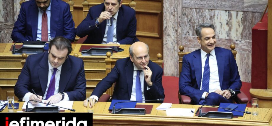 Κυριάκος Πιερρακάκης, Κωστής Χατζηδάκης και Κυριάκος Μητσοτάκης κατά τη συζήτηση για τον προϋπολογισμό / Φωτογραφία: Εurokinissi, ΓΙΩΡΓΟΣ ΚΟΝΤΑΡΙΝΗΣ